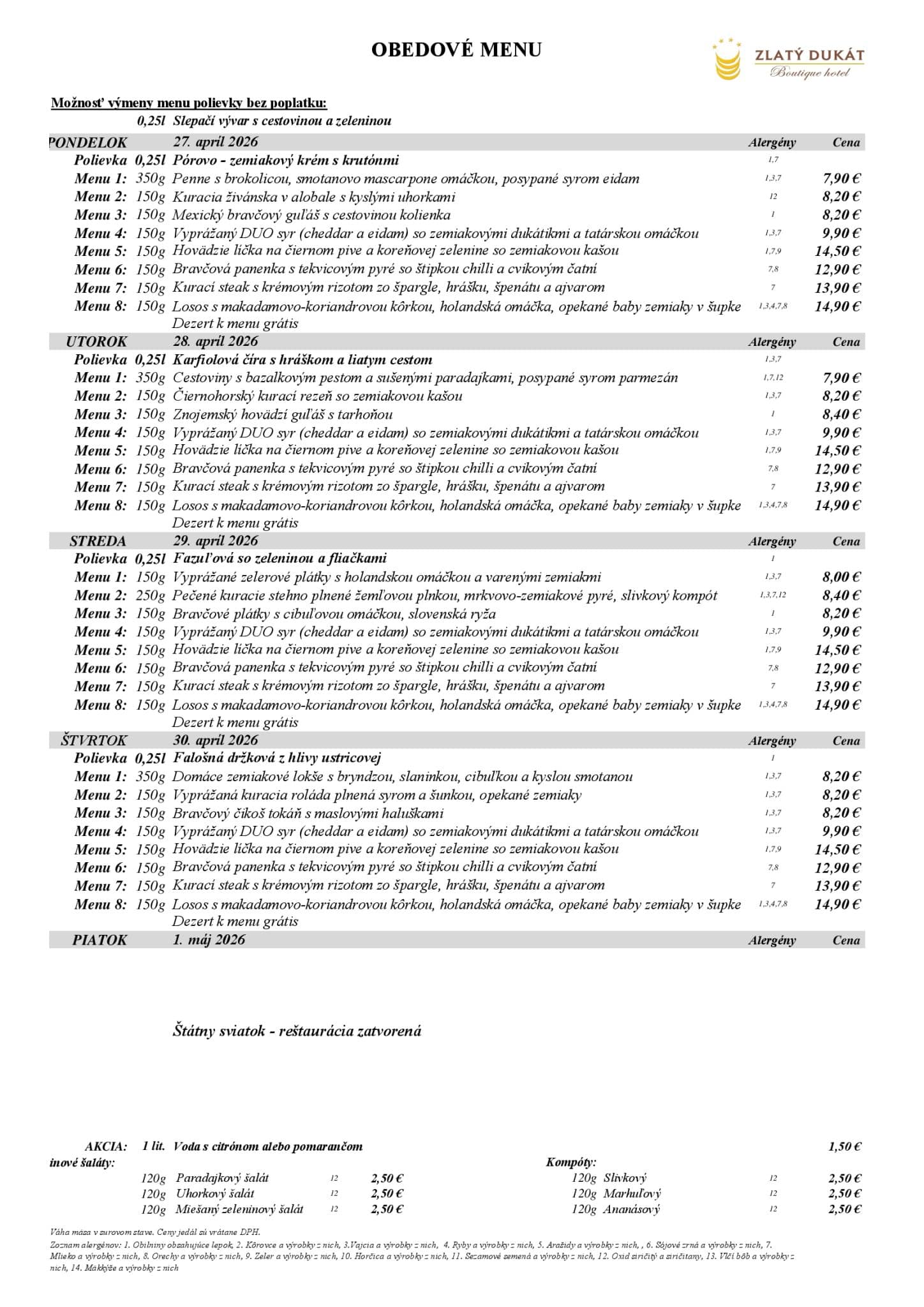 Obedové menu od 27.04.2026 do 01.05.2026